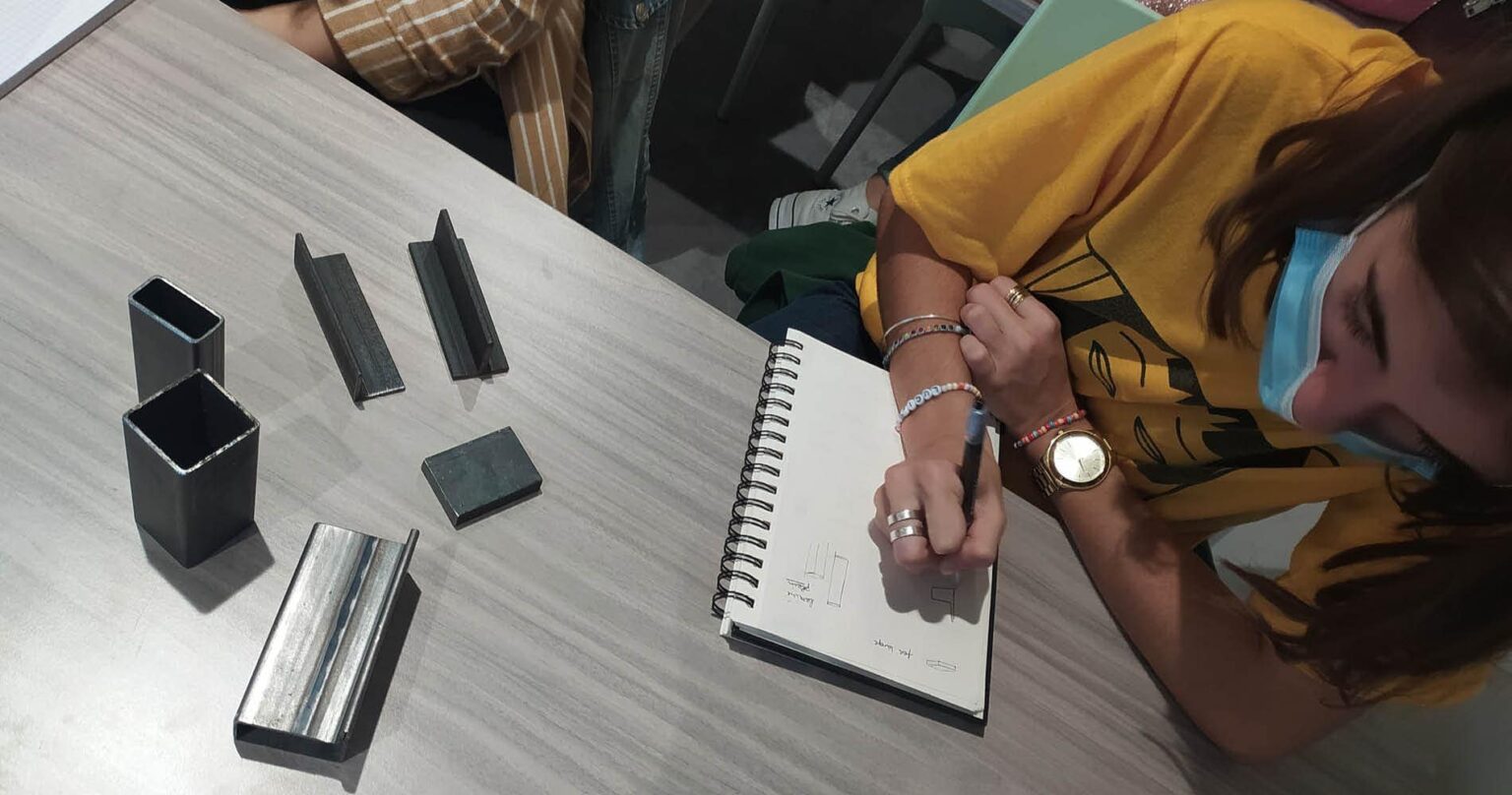 Selon le travail effectué, les finitions du métal ne sont pas les mêmes également : brut, thermolaqué, galvanisé, brossé, vieilli… des rendus et des techniques de travail différentes. A cela s’ajoute aussi les propriétés de l’acier qu’Alexandre Azoulai a présenté aux élèves à travers plusieurs profilés d’acier, en expliquant les résistances, les déformations et formes possibles… Selon les choix effectués pour les réalisations, cela aura aussi un impact sur le plan financier du projet, une notion importante à garder en tête pour nos étudiants lors de leur relation client.